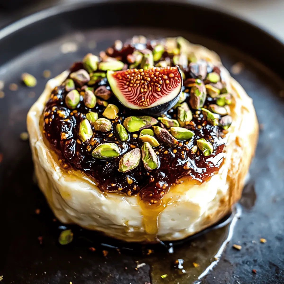 Decadent Delight: Baked Brie with Honey, Fig, and Pistachio is a feast for the senses, with its creamy center melting beautifully under a warm, golden crust.